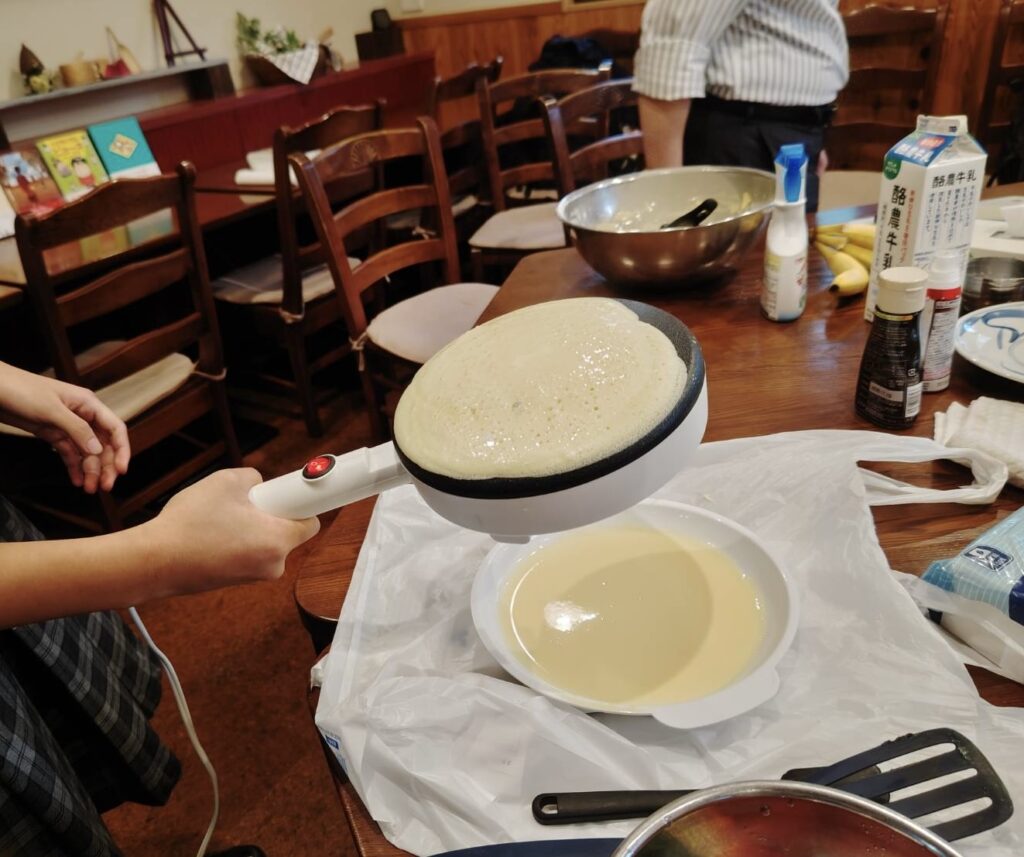 木の根っこのアドバイザーの神谷さんがクレ―プメ―カ―を持ってきてくれました。