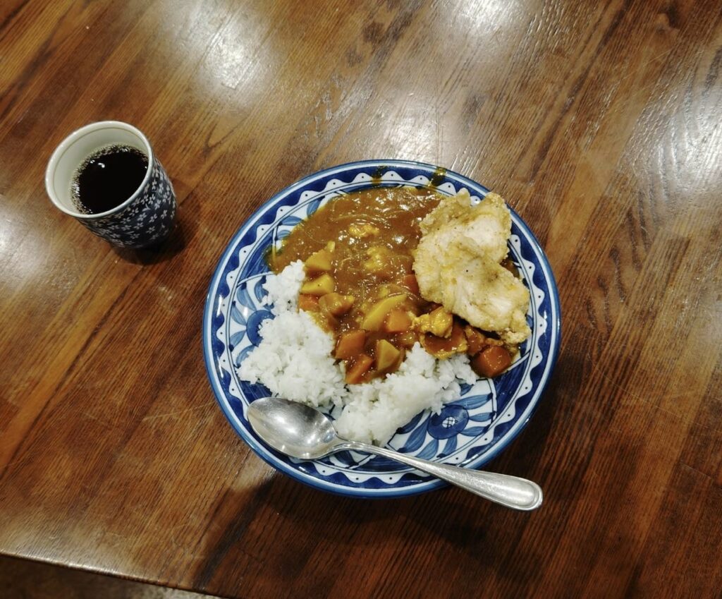待ちに待ったカレータイム。鶏の唐揚げが乗った里芋カレー、ジャガイモよりコクがあって美味しかったです!!カレーの食べ歩きが趣味の黒澤さん。